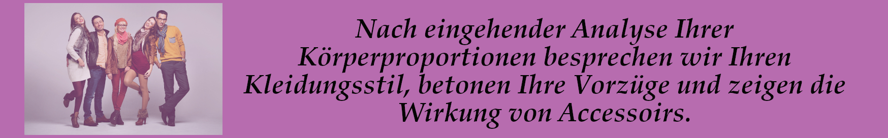 In der Beratung starten wir mit einer eingehenden Analyse ihrer Gesichtsform mit zusätzlichen wertvollen Kosmetik- und Frisurtipps. Anschließend schauen wir uns sehr genau Ihre Körperlinie und –proportionen an und ich zeige Ihnen, wie Sie Problemzonen gekonnt kaschieren können. Ein weiterer Schwerpunkt ist die Ermittlung ihres Grund-Stiltypes und wie Sie eine gezielte Außenwirkung erreichen können, durch Entwicklung des eignen Looks der zu Ihnen, Ihrem Stil und den jeweiligen Bedürfnissen des Anlasses passt.
